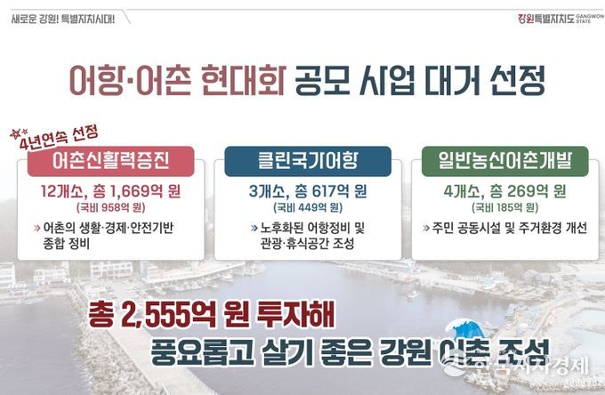 한국시사경제 경제팀 | 강원특별자치도는 해양수산부가 추진하는 어항・어촌 현대화 공모사업에 대거 선정됨에 따라, 2030년까지 총 2,555억 원(국비 1,592억 원)을 투입해 살기 좋은 강원어촌을 비전으로 본격적인 어촌 대전환을 추진하겠다고 밝혔다.