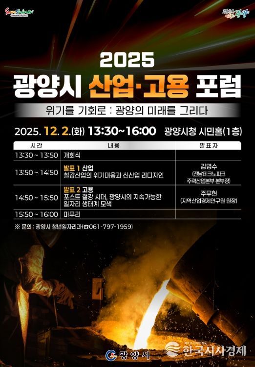 한국시사경제 경제팀 | 광양시는 오는 12월 2일 오후 1시 30분, 시청 시민홀에서 ‘2025 광양시 산업・고용 포럼’을 개최한다고 밝혔다.