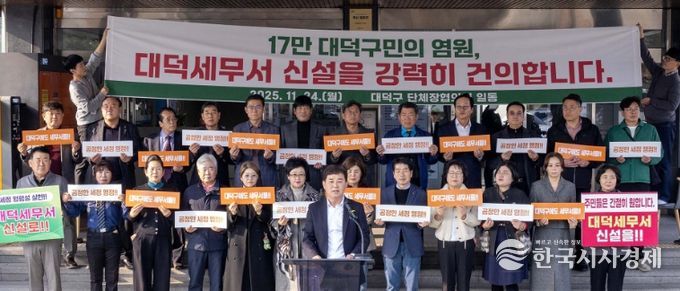 한국시사경제 대전취재본부 | 대전 대덕구는 대덕구단체장협의회가 24일 구청 현관에서 ‘대덕세무서(가칭)’ 조속 신설을 촉구하는 공식 건의문을 발표했다고 밝혔다.