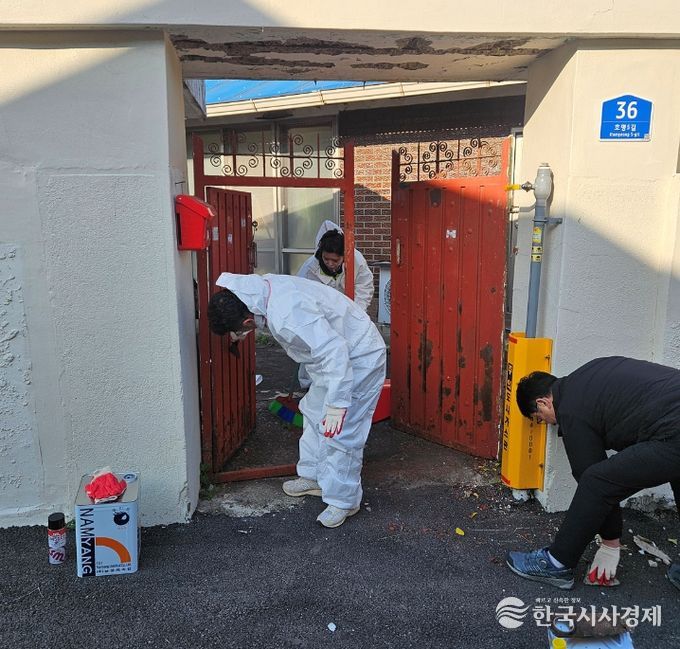 한국시사경제 문화팀 | 삼일동 연합청년회(회장 백훈호)는 지난 23일 관내 가구의 대문 도장과 외벽 도색 재능기부 활동을 펼치며 주거환경 개선에 나섰다.
