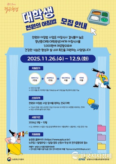 한국시사경제 문화팀 | 농림축산식품부는 전국 대학교와 산업단지 입주기업 또는 협의체 등 조직을 대상으로 2026년도 천원의 아침밥 사업 참여 신청을 11월 26일부터 12월 9일까지 접수한다.