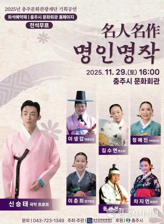 한국시사경제 충북취재본부 | 충주문화관광재단은 오는 29일 오후 4시 충주문화회관에서 대한민국을 대표하는 국악 명인들을 중심으로한 기획국악공연‘名人名作(명인명작)’을 선보인다.