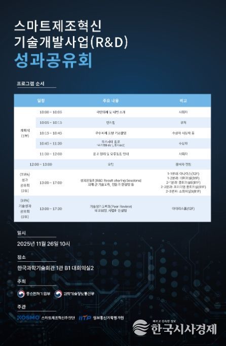 한국시사경제 디지털 뉴스팀 | 과학기술정보통신부는 중소벤처기업부와 함께 중소기업의 지능형 제조(스마트제조) 역량 고도화를 지원하기 위해 추진 중인 ‘지능형 제조(스마트제조) 혁신 기술 개발’ 사업의 성과를 공유하고, 제조 현장 확산을 위한 성과공유회를 11월 26일 한국과학기술회관에서 공동으로 개최할 예정이라고 밝혔다.