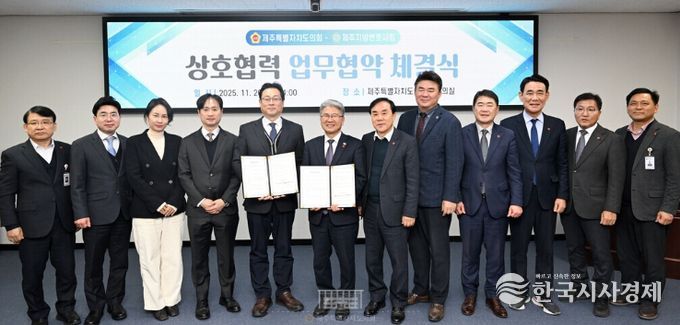 한국시사경제 노승선 기자 | 제주특별자치도의회와 제주지방변호사회(회장 고영권)는 11월 26일 제주특별자치도의회 소회의실에서 도민 권익 보호와 4·3 관련 법률지원 강화를 위한 상호협력 업무협약을 체결했다.