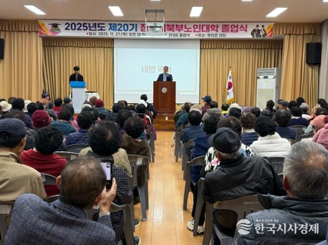 정읍시북부노인대학은 27일 정읍시북부노인복지관 강당에서 제20기 졸업식을 열고, 지난 4월부터 28회 교육 과정을 무사히 마친 170명 어르신에게 축하를 전했다.
