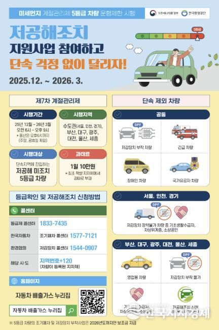 배출가스 5등급 차량 운행 제한의 경우 계절관리제 시행 기간 동안 배출가스 5등급 차량은 주말 및 공휴일을 제외하고 매일 오전 6시부터 오후 9시까지 수도권과 6개 특·광역시에서 운행이 제한되며, 위반 시 10만 원의 과태료가 부과된다.