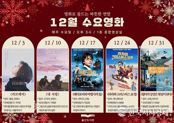 한국시사경제 울산취재본부 | 울산도서관이 12월 한 달 동안 ‘영화로 물드는 따뜻한 연말’을 주제로 매주 수요일 오후 3시 도서관 1층 종합영상실에서 수요영화를 상영한다.