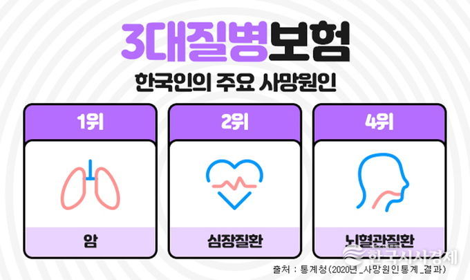 한국시사경제 경제팀 | 한국인의 주요 사망원인중에 암, 뇌혈관질환, 심혈관질환은 흔히 3대질병이라 일컬어지며 살아가면서 가장 먼저 대비해야 하는 중대질병으로 항상 강조되고 있다. 이들 질병에 미리 대비하기 위해 가입하는 것이 진단비보험인데, 이러한 3대질병진단비를 중점으로 보장하는 보장성보험이 3대진단비보험 이다. 3대질병진단비보험은 각각의 질병에 주목해서 보장하기도 하지만, 나에게 맞는 추가 특약을 잘 골라서 가입한다면 종합건강보험으로도 충분히 활용도가 높다.