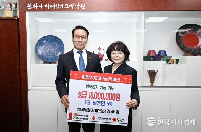 한국시사경제 전북취재본부 | 남원시는 '희망2026 나눔 캠페인'의 본격적인 시작과 함께, 매년 꾸준한 나눔을 실천해 온 김숙희 회장(법무부 법사랑위원 남원지구협의회)이 올해도 변함없는 기부 참여로 남원시 1호 기부자가 됐다고 밝혔다.