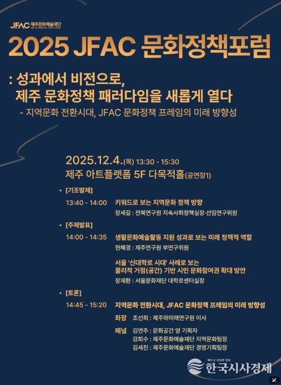 한국시사경제 노승선 기자 | 제주문화예술재단(이사장 김석윤)은 '다시 심는 성과, 피어나는 비전'이라는 슬로건으로 '2025년 재단 성과공유주간(이하 성과공유주간)'을 개최한다. 프로그램은 제주아트플랫폼(5층)에서 12월 4일부터 6일까지 3일간 진행된다.