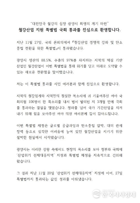 한국시사경제 경제팀 | 광양시는 지난 11월 27일 국회 본회의에서 '철강산업 경쟁력 강화 및 저탄소 전환 촉진을 위한 특별법(이하 ‘K-스틸법’)'이 통과된 데 대해 환영의 뜻을 밝혔다.