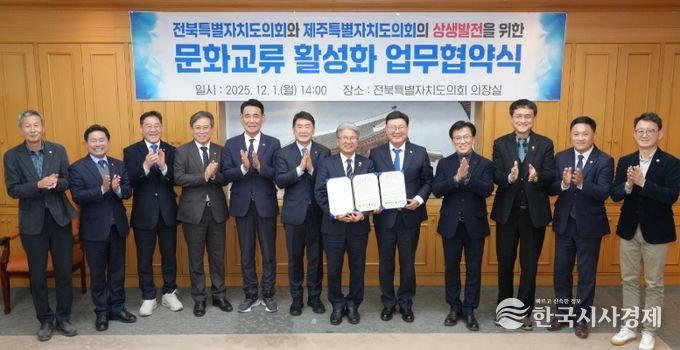 한국시사경제 김태훈 기자 | 전북특별자치도의회와 제주특별자치도의회는 문화·관광·세계유산 분야 협력을 강화하기 위해 1일 전북도의회 의장실에서 문화교류 활성화 업무협약(MOU)을 체결했다.