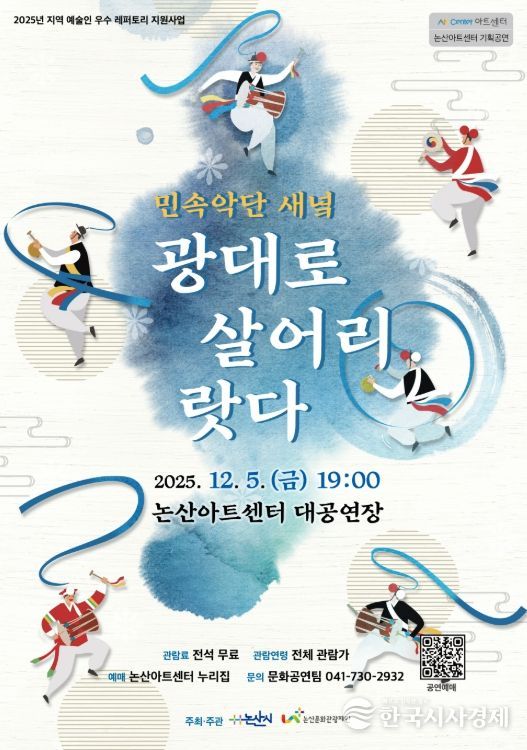 한국시사경제 김태훈 기자 | (재)논산문화관광재단은 오는 12월 5일 19시에 논산아트센터 대공연장에서 ‘민속악단 새녘 '광대로 살어리랏다'’ 공연을 진행한다고 밝혔다.