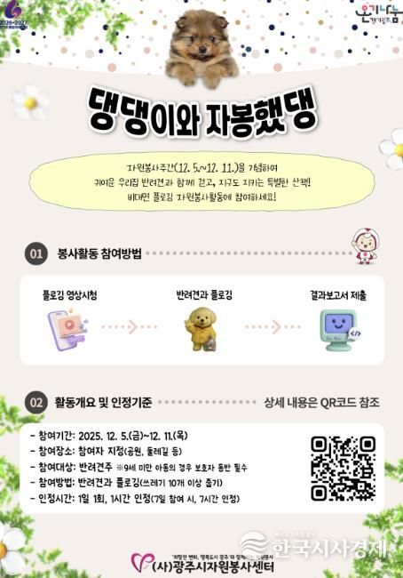 한국시사경제 기동취재팀 | 사단법인 광주시자원봉사센터는 국내 반려가구가 591만 가구로 전체 인구의 약 30%에 달하는 증가 추세를 반영하여, 반려동물과 함께 참여하는 비대면 가족 자원봉사활동 ‘댕댕이와 자봉했댕’을 오는 12월 5일부터 12월 11일까지 운영한다.