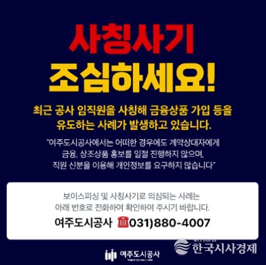 한국시사경제 기동취재팀 | 여주도시공사는 공공기관을 사칭한 보이스피싱 사기 범죄 피해가 증가함에 따라 협력기업을 보호하고 지역사회 피해를 최소화하기 위해 적극 대응에 나서고 있다고 밝혔다.