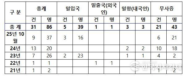 해양경찰청은, 지난 9월 8일 제주로 밀입국한 중국인 6명을 4일간의 추적 끝에 전원 검거했고, 10월 5일에는 태안군 가의도로 소형보트를 이용 밀입국을 시도한 중국인 8명을 해상에서 전원 검거한 바 있다.