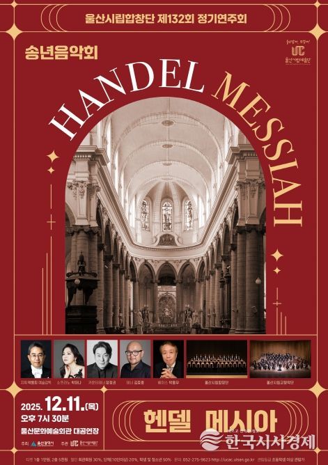 한국시사경제 울산취재본부 | 울산시립합창단이 오는 12월 11일 오후 7시 30분 울산문화예술회관 대공연장에서 제132회 정기연주회로 송년 음악회 헨델(G.F Handel) ‘메시아(Messiah)’를 선보인다.