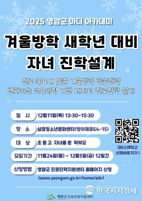 한국시사경제 권충현 기자 | 영암군진로진학지원센터가 11일 삼호청소년문화센터에서 ‘겨울방학 새학년 대비 자녀 진학설계’를 주제로 ‘2025 마더 아카데미’를 개최한다.