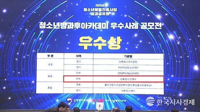 한국시사경제 윤광희 기자 | 인천시 남동구 남동청소년센터 청소년방과후아카데미는 한국청소년활동진흥원에서 진행한 2025년 청소년방과후아카데미 공모전 우수사례 부문에서 우수상을 받았다고 3일 밝혔다.