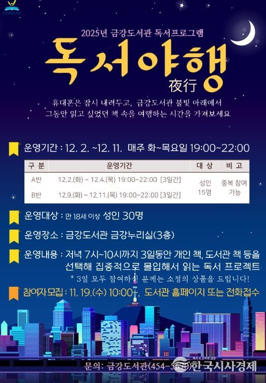 금강도서관은 책에 깊이 몰입하고 싶은 성인 30명을 대상으로 12월 11일까지 사이 3일 3시간 동안 ‘독서야夜행行’ 을 준비해, 연말의 분주함 속에서 나만의 조용한 독서 시간을 확보해 깊이 있는 독서를 즐길 수 있도록 배려할 예정이다.