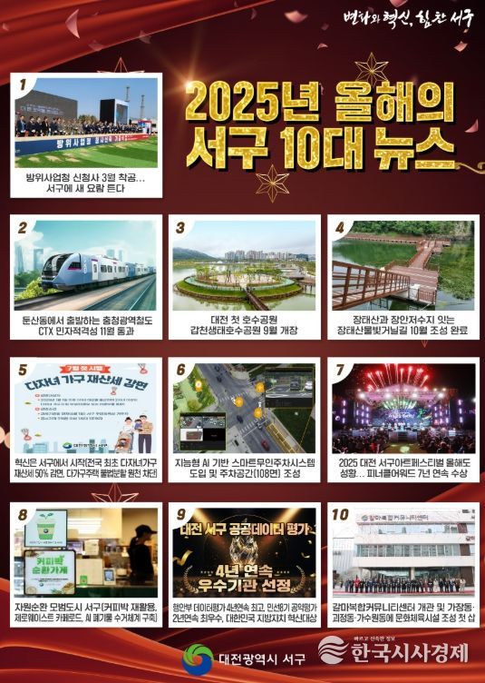 한국시사경제 대전취재본부 | 2025년 대전 서구 10대 뉴스로 교통·공원 분야 정책이 주목받은 것으로 나타났다.