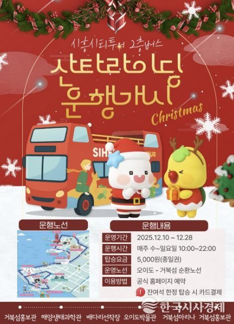 한국시사경제 경기취재본부 | 시흥시는 연말을 맞아 오이도~거북섬을 순환하는 2층 버스에 크리스마스 테마를 적용한 특별 운행 ‘산타라이딩’을 12월 10일부터 운영한다. 이번 테마 운행은 겨울철 해양 관광 활성화와 연말 분위기 조성을 위해 조성을 위해 마련된 것으로, 12월 28일까지 운행되며 상황에 따라 기간은 연장될 수 있다.