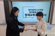 한국시사경제 광주취재본부 | 광주시교육청은 7일 본청 중회의실에서 ‘2025년 청렴 슬로건 및 숏폼 영상 공모전 학생부 시상식’을 진행했다. 올해 ‘청렴 슬로건 및 숏폼 영상 공모전’은 지난 8월 ‘공감·신뢰·적극·존중·투명으로 청렴한 광주교육 만들기’를 주제로 학생, 교직원, 시민이 참여한 가운데 진행됐다. 이번 공모전에는 슬로건 부문 278건, 숏폼 영상 부문 16건 등 294건이 접수돼 경쟁을 벌였다. 공모 결과 학생부는 슬로건 6건, 숏폼 영상 3건 등 9건, 일반부는 슬로건 5건, 숏폼영상 3건 등 8건이 수상 대상으로 선정됐다. 학생부 최우수상은 ▲슬로건 부문 ‘후회를 부르는 청탁! 희망을 부르는 청렴!’(고려중학교 정의찬 학생) ▲숏폼 영상 부문 ‘청렴은 오늘 우리가 선택해야 하는 가장 빛나는 것’(전남대사대부고 팀·진영찬 외 4명) 등이 각각 받았다. 또 광주세광학교 이빈 학생 외 4명이 만든 ’광주광역시교육청 깨끗한(청렴한) 바다로 는 숏폼 영상 부문 우수상으로 선정됐다. 이 작품은 시각장애 학생들이 학교생활의 일상을 청렴의 시선으로 풀어내 호평을 받았다.