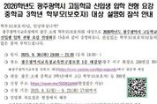 한국시사경제 광주취재본부 | 광주시교육청은 오는 30일 오후 7시 광주시교육청교육연구정보원 대강당에서 중학교 3학년 학생과 학부모를 대상으로 ‘고입 전형요강 설명회’를 개최한다. 이번 설명회는 고등학교 입학을 앞둔 학생·학부모의 궁금증을 해소하고, 진로·진학 선택에 도움을 주기 위해 마련됐다. 설명회에서는 ▲자율형공립고 ▲과학중점학교 ▲전기고(마이스터고・특성화고・특목고・예술고·체육고 등) ▲후기 일반고 전형요강 등을 안내하고 질의응답을 진행한다. 설명회 참여 신청은 오는 23일까지 온라인'으로 하면 된다. 현장 접수도 가능하며, 행사에 참석하지 못하는 학부모를 위해 시교육청 유튜브 채널을 통해 실시간 중계할 예정이다. 올해 고등학교 원서 접수는 ▲10월 20일 산업수요맞춤형고(마이스터고) 및 광주형마이스터고 ▲10월 21일 광주예술고 ▲11월 3일 광주체육고 ▲11월 24일 특성화고 ▲12월 16일 자율형공립고, 과학중점고를 포함한 평준화 일반고 등 순으로 시작된다. 평준화 일반고 합격자 발표는 2026년 1월 8일이며, 배정 발표는 1월 22일 이뤄진다. 또 학교장이 직접