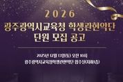 한국시사경제 광주취재본부 | 광주시교육청학생교육문화회관은 ‘2026 광주광역시교육청 학생관현악단’ 신규 단원을 모집한다. 시교육청 학생관현악단은 학생들의 음악적 기량과 감수성을 키우기 위해 운영되고 있다. 매주 토요일 합주연습과 연주회, 기획공연 참여 등 다양한 음악 활동을 펼친다. 모집 대상은 광주지역 초등학교 3학년~고등학교 2학년 학생, 같은 연령대 학교 밖 청소년 등이다. 관현악 합주 연주 능력이 있고 음악활동에 관심이 있는 학생, 청소년이라면 오는 3~10일 학교장 추천 서류를 접수하거나 개별 방문 접수하면 된다. 분야는 바이올린, 비올라, 첼로, 콘트라베이스, 플루트, 오보에, 클라리넷, 바순, 호른, 트럼펫, 트럼본, 튜바, 타악기 등이다. 공개 오디션은 오는 13일 오전 10시 학생교육문화회관 지하 1층 학생관현악단 합주실에서 진행된다. 지원자는 자유곡 1곡을 준비해야 하며, 악보를 보고 연주할 수 있다. 단, 반주자는 동반할 수 없으며, 개인 악기를 지참해야 한다.(콘트라베이스, 타악기 제외) 단원 모집 관련 내용은 학생