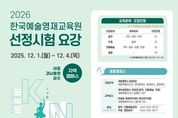 한국시사경제 광주취재본부 | 광주광역시는 한국예술종합학교 부설기관인 한국예술영재교육원 광주캠퍼스의 2026년도 교육생을 오는 12월 1일부터 4일까지 모집한다고 13일 밝혔다. 한국예술영재교육원 광주캠퍼스는 수도권에 집중돼 있는 예술영재교육을 지역에서도 받을 수 있도록 지난 2021년 광주시와 한국예술종합학교, 국립아시아문화전당이 협약해 2023년 정식 개원한 호남권 예술영재 교육기관이다. 이번 모집에는 일반전형으로 ▲음악(기악·성악·작곡) 31명 ▲무용(발레) 15명 ▲전통예술(기악·성악·무용·연희) 19명 ▲융합(영상·멀티미디어) 10명 등 75명을 선발하며, 사회적배려 대상자 전형은 일반전형의 30% 이내에서 별도로 모집한다. 지원 자격은 광주·전남·전북지역에 주민등록을 둔 2008년 1월1일부터 2017년 12월31일까지 출생자(세부 전공별로 기준 다름)로, 재학 중인 학교(대안교육기관 포함)의 장이나 교사의 추천을 받아야 한다. 가정 내 학습자의 경우 지원 전공 분야 지도자의 추천서가 필요하다. 교육 기간은 2026년 3월부터 11월까지며, 교육비는 전액 무료로 지원된다. 자세