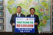 한국시사경제 권충언 기자 | 전남 곡성군은 지난 17일 여수시 화장동에 소재한 (유)용수종합건설(대표 우정욱)에서 곡성군 노인맞춤돌봄서비스 이용 어르신을 지원하기 위해 현금 500만 원을 기탁했다고 18일 밝혔다. 이번 기부금은 노인맞춤돌봄서비스 지원사업 수행기관인 곡성노인맞춤돌봄센터에서 돌봄서비스를 제공받는 912명의 어르신을 대상으로 추진되는 프로그램 운영에 활용될 예정이다. 기탁식에는 우정욱 대표를 포함하여 3명이 참석했으며, 우정욱 대표는“일상생활 영위가 어려운 취약 어르신들에게 적절한 돌봄서비스가 제공될 수 있도록 작은 정성을 보탤 수 있엉 매우 뜻깊다”라며, “앞으로도 지속적인 나눔 활동을 이어가겠다”라고 덧붙였다. 조상래 곡성군수는“어려운 경기 상황에서도 지역사회 취약 어르신들에게 온정을 베풀어 주신 용수종합건설 우정욱 대표에게 깊은 감사의 뜻을 표하며, 기부금이 노인맞춤돌봄서비스 대상 어르신들에게 잘 활용될 수 있도록 하겠다”라고 전했다.