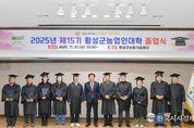 한국시사경제 권충언 기자 | 횡성군농업인대학은 21일 횡성군농업기술센터에서 ‘2025년 제15기 횡성군농업인대학 졸업식’을 진행했다. 제15기 농업인대학은 지난 2월부터 11월까지 횡성사과, 횡성한우, 미래농업인, 농업경영최고사관CEO 등 4개의 과정을 운영했으며, 총 93회 425시간의 교육을 자체강사와 각 분야의 전문가 등을 초빙해 실습 위주의 현장 중심 교육으로 추진했다. 횡성군농업인대학은 횡성농업의 특화 발전을 위한 품목별 장기 기술교육 기관으로 자리잡고 있으며, 올해는 총 90명의 수료생을 배출했다. 졸업식에는 김명기 군수와 횡성군의회 의장을 비롯해 내빈 및 90여 명의 수료생이 참석했으며, 농촌자원과장의 학사보고를 시작으로 공로상 및 개근상, 성적우수상, 졸업장 수여, 축사, 답사, 기념촬영 순으로 진행됐다. 김명기 횡성군수는 “졸업생들이 오늘의 성취를 바탕으로 더 큰 도전과 성장을 이어가길 바라며, 앞으로도 농업·농촌이 미래 경제성장 동력으로서 지속적으로 발전할 수 있도록 다양한 농업인교육을 추진하겠다”고 말했다.