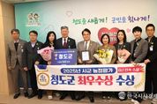 한국시사경제 권충언 기자 | 청도군은 경북도에서 실시한 2025년 시군 농정평가에서 최우수기관으로 선정되어 지난 11일 경북여성가족플라자 대강당에서 열린 제30회 농업인의 날 행사에서 도지사 기관표창을 받았다. 경북도 농정평가는 22개 시·군을 대상으로 한 해 동안의 ▲농업정책▲농식품유통▲스마트농업혁신▲축산정책▲동물방역▲특수시책 등 농정업무 전반을 종합적으로 평가하는 것으로, 청도군은 이번 평가에서 ‘청도형 농업대전환 프로젝트’ 추진 성과와 스마트농업 기반 확충, 농식품 수출 확대, 지역 특화시책 발굴 등 전 부문에서 우수한 평가를 받았다. 특히 청도군은 ‘농업대전환’의 체계적 추진으로 지역 농정 혁신을 선도했다. 전담 TF 운영과 중장기 전략 수립을 통해 추진기반을 강화하고, 언론홍보와 발대식으로 대외 인지도를 높였다. 또한 농업인 의식전환 교육과 시범단지 운영으로 현장 중심의 변화를 이끌었으며, 청도반시 비상품자원화센터 운영과 납작복숭아 브랜드화 추진 등 지역 특화농업 발전에도 뚜렷한 성과를 거두었다. 김하수 청도군수는 “6년 연속 수상은 청도군의 농정정책이 현장에서 실질적인 성과를 거두고 있음