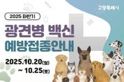 한국시사경제 권충현 기자 | 고양특례시는 2025년 하반기 광견병 예방접종을 10월 20일부터 실시한다고 밝혔다. 광견병은 주로 야생동물에 의해 전파되며 감염된 반려동물에서 사람에게 전염될 수 있는 치명적인 인수공통전염병이다. 이에 따라 매년 1회 반려동물에게 광견병 예방백신을 접종하는 것이 중요하다. 올해 상반기에 접종을 마친 반려동물의 경우 재접종 하지 않아도 된다. 접종 기간은 오는 10월 20일부터 10월 25일까지로 3개월령 이상 개를 대상으로 광견병 예방접종을 실시한다. 접종 기간 중 반려동물과 함께 거주지 인근 지정 동물병원(37개 병원/고양시 누리집 참조)을 방문하여 무료로 광견병 예방접종을 할 수 있다. 예방접종은 반드시 동물등록이 돼 있어야 지원받을 수 있으며 동물등록을 하지 않은 반려견은 동물병원에서 동물등록(자부담 1만원)하고, 접종을 받으면 된다. 임신 또는 이상 소견이 있는 경우에는 접종이 불가능하므로 사전에 수의사와 충분히 상담해야 한다. 이번 광견병 예방접종 지원에 참여하는 동물병원은 고양시 누리집(정보공개- 고양소식- 새소식 – 광