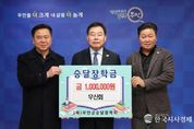 한국시사경제 권충현 기자 | 무안군은 지난 1월 19일 무신회 박석현 회장이 지역 인재 육성을 지원하기 위해 (재)무안군승달장학회에 장학금 100만 원을 기탁했다고 밝혔다. 무신회는 무안군 관내 1968년생으로 구성된 친목 모임으로, 회원 간 교류를 넘어 지역사회에 기여할 수 있는 나눔 활동을 모색해 오던 중 지역 학생들이 경제적 여건에 관계없이 자신의 꿈에 도전할 수 있도록 돕기 위해 뜻을 모아 마련됐다. 무신회는 이번 승달장학금 기탁을 계기로, 앞으로 취약계층 지원 등 지역사회를 위한 나눔 활동을 정기적으로 추진해 나갈 계획이다. 목포무안신안축협 기획실장이자 무신회 회장인 박석현 회장은 기탁식에서 “회원들 대부분이 무안에서 태어나거나 자라며 지역의 도움 속에서 성장해 왔다”며 “비록 큰 금액은 아니지만 후배 세대에게 작은 응원과 희망이 되길 바란다”고 말했다. 한편 지역 인재 양성을 목표로 설립된 (재)무안군승달장학회는 올해 상반기 중 성적우수, 다자녀, 다문화, 저소득층 등 총 200명의 장학생을 선발해 2억1,300만 원 규모의 장학금을 지급할 예정이다.