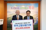 한국시사경제 김숙영 기자 | DH그룹(동해금속(주), 나봄리조트 등) 서동해 회장이 지난 24일 무주군에 고향사랑기부금 5백만 원을 기탁했다. 이날 서동해 회장은 "무주군은 나봄리조트를 통해 소중한 인연을 이어가고 있는 곳”이라며 “무주군과의 상생을 위해 앞으로도 세심한 관심을 쏟을 것”이라고 밝혔다. 전북 완주군에 본사를 둔 DH그룹은 주력 사업인 상용차 및 승용차 부품 생산 분야에서 ‘작지만 강한 기업’으로서의 입지를 확고히 하고 있으며 무주군 설천면에서는 나봄리조트를 운영하고 있다. 봉사 경영을 통한 사회 환원에도 적극적인 것으로도 알려진 DH그룹은 2008년에 설립된 '권정순 장학재단'을 통해 저소득층 지원, 청소년 장학사업, 소외된 이웃돕기 등 사회공헌 활동에 연간 3억여 원을 투입하고 있다. 무주군에는 2023년부터 3년간 총 1천1백만 원의 고향사랑기부금을 기탁해 훈훈함을 전하고 있다.