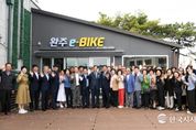 한국시사경제 김숙영 기자 | 완주군이 삼례 ‘쉬어가삼[례:]’ 유휴공간을 친환경 관광 거점으로 새롭게 탈바꿈 시키고, 체류형 관광객 유치를 위한 힘찬 시동을 걸었다. 30일 완주군은 삼례 ‘쉬어가삼[례:]’에서 ‘e-BIKE 자전거 대여소’ 개소식을 열었다. 이 자리에는 유희태 완주군수와 군의원, 지역주민 등 100여 명이 참석했다. 이날 첫선을 보인 자전거 대여소는 유휴공간을 활용해 지역 관광의 핵심 거점으로 재탄생시켜 주목을 받았다. 문화체육관광부의 ‘지역 자전거 여행 활성화’ 국가 공모사업에 선정돼 국비를 지원받아 추진됐으며, 올해부터 내년까지 2개년에 걸쳐 진행될 예정이다. 자전거 대여소는 삼례역에 내린 관광객 및 완주군민들에게 근대문화유산인 삼례문화예술촌을 지나 만경강 자전거길로 나아가는 ‘친환경 생태관광의 관문’ 역할을 수행하게 된다. 유희태 완주군수는 “버려진 공간을 재생해 완주 관광의 새로운 원동력을 만들고, 군민 여러분과 함께 그 출발을 축하하게 되어 매우 기쁘다”며 “오늘 문을 연 자전거 대여소를 시작으로 완주를 찾는 모든 분들이 만족하는 체류형 관광도시를
