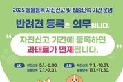 한국시사경제 김태훈 기자 | 금산군은 10월 31일까지 동물등록 자진신고 기간을 운영한다. 동물등록제는 동물보호법에 따라 유실·유기 동물의 발생을 예방하고 성숙한 반려동물 문화 정착을 위해 시행 중인 제도다. 가정이나 그 외 장소에서 기르는 2개월령 이상의 개는 반드시 관할 지자체에 동물등록을 해야 하며 소유자 정보나 등록 동물에 대한 변경 사항이 발생할 경우 30일 이내에 변경 신고를 해야 한다. 단, 대행 동물병원이 없는 금산읍 외 지역은 동물보호법에 따라 동물등록 의무에서 제외된다. 자진신고 기간 내에 등록 또는 변경 신고를 완료하면 과태료가 면제되지만 이를 이행하지 않으면 최대 100만 원 이하의 과태료가 부과될 수 있다. 동물등록은 반려동물과 함께 관내 동물등록 대행 동물병원을 방문해 진행할 수 있다. 금산군의 등록 대행 동물병원은 우신동물병원, 하나동물병원, 제일동물병원 3곳이다. 등록 수수료는 내장형 1만 원이며 등록칩 가격과 시술비용은 병원별로 다를 수 있다. 이 외에도 군은 생후 5개월령 이상의 실외사육견(마당개)을 대상으로 중성화수