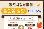한국시사경제 김태훈 기자 | 강진군은 9월29일부터 12월31일까지 강진사랑상품권 할인율을 상향 조정한다고 24일 밝혔다. 추석 명절 맞이 및 지역경제 회복을 위해 마련된 할인 혜택은 지류 및 모바일(착) 강진사랑상품권 구매 시 선할인 10%이며, 기간 중 모바일(착) 사용 시 후캐시백 적립 5%로 총 15% 할인 혜택을 받을 수 있다. 구매 한도는 월 70만 원으로 동일하다. 다만, 모바일(착) 상품권 후캐시백은 매월 1억 원을 투입할 예정으로 예산소진 시 운영이 종료되므로 혜택을 받기 위해서는 빠르게 소비하는 것이 유리하다. 관내 모바일(착) 상품권은 음식점, 전통시장, 주유소, 미용실, 병원, 마트 등 지역 내 1,600여 개의 가맹점에서 사용할 수 있다. 자세한 가맹점 안내는 강진군 홈페이지 및 지역상품권 chak(앱) ‘가맹점 찾기’에서 확인할 수 있다. 모바일(착) 상품권 한 이용자는 “상품권을 충전할 때 10% 할인받는 것도 좋지만, 결제할 때마다 캐시백을 적립해 주니 쓰는 재미가 있어서 착을 더 이용한다”며 “명절 연휴뿐만 아니라 3개월동안 15% 할인혜택을
