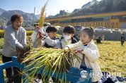 한국시사경제 노승선 기자 | 울릉군은 11월 6일 서면 태하리 울릉 개척사 부지 일원 다랑논에서 지난 5월에 모내기했던 중만생종 벼 품종『영진(밀양283호)』에 대하여 벼 베기 및 전통 탈곡 체험행사를 개최했다. 특히 올해 행사는 1987년 이후 중단됐다가 36년 만인 2023년에 재개된 울릉도 벼농사의 소중한 첫 결실을 기념하고 섬 개척민들의 땀과 노력을 되새기기 위해 마련됐다 이번 행사는 남한권 군수, 군의회 의원, 농협중앙회울릉군지부, 울릉농협, 울릉군농업인단체회원들과 태하리 주민 60여 명이 참석했다. 이와 더불어 저동초등학교 학생과 선생님 43명이 현장 체험학습으로 참여하여 낫으로 직접 벼를 베고 전통 농기구(홀태)를 이용한 옛날 방식의 벼 탈곡을 체험했고, 이어 콤바인에 승선하여 벼를 수확하면서 동시에 탈곡하는 과정을 체험하여 연신 신나는 표정을 지으며 즐거운 시간을 보냈다. 수확에 참여한 한 주민은 “예전에 힘들게 모내기하고 벼 수확하던 기억이 아련하게 되새겨진다며, 세월이 많이 변해 울릉도에서 콤바인으로 수확하는 걸 보니 감회가 새롭다면서도, 특히나 미래의 주역인 아이들이 벼 수확 체