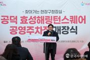 한국시사경제 노승선 기자 | 박강수 마포구청장은 12월 3일 오후 5시, 공덕역 10번 출구 앞 광장에서 열린 ‘공덕 효성해링턴스퀘어 공영주차장 개장식’에 참석해 시설 개장을 축하했다. 이번에 문을 연 공덕 효성해링턴 스퀘어 공영주차장(도화동 25-13)은 총 21면 규모로 조성된 거주자우선주차장으로, 구는 공공기여를 통해 확보한 이 공간을 주민들에게 개방해 운영하기로 했다. 아파트와 상가, 오피스가 밀집한 도화동·공덕동 일대는 주차 수요에 비해 공간이 부족해 주민과 방문객 모두가 지속적인 불편을 겪어 왔다. 이번 공영주차장 운영을 통해 지역에서 꾸준히 제기돼 온 주차 불편이 상당 부분 해소될 것으로 기대되며, 생활권 내 주차 편의도 한층 개선될 전망이다. 행사는 식전 공연을 시작으로 개회 및 내빈소개, 경과보고에 이어 박강수 마포구청장의 기념사가 진행됐으며, 이어 테이프 커팅과 기념촬영 후 시설 라운딩이 이어졌다. 추운 날씨 속에서도 박강수 마포구청장을 비롯해 백남환 구의회 의장, 지역 주민 등 약 100여 명이 참석해 주차 공간 확충의 성과를 함께 축하했다. 박강수
