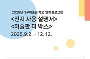 한국시사경제 대구취재본부 | 대구문화예술진흥원 대구미술관은 초·중·고 학생들의 문화예술 향유 기회를 확대하고, 융합적 사고와 창의적 역량을 키우기 위해 오는 9월 2일부터 12월 12일까지 2025년 하반기 학교 연계 교육프로그램을 운영한다. ‘전시 사용 설명서’와 ‘미술관 더 박스’는 단순한 전시 관람을 넘어 학생들이 학습의 장으로서 미술관을 경험하고, 나아가 미래 진로까지 탐색할 수 있도록 기획한 프로그램이다. 이는 교실 안팎을 잇는 통합적 교육 과정을 통해 문화예술을 일상적 배움의 영역으로 받아들이는 데 중점을 두고 있다. 중·고등학생 대상의 진로체험 교육인 ‘전시 사용 설명서’는 대구미술관 소장품 하이라이트 전시를 작품 해설과 함께 감상하고, 다양한 미술관 직업군을 탐구한다. 또한 전시 기획자의 시각에서 직접 전시 주제를 선정하고 전시 공간을 구상해 보는 시간을 가진다. 이는 예술감상, 진로탐색, 창의적 문제 해결을 유기적으로 결합해, 학생들의 자기 주도적 학습 역량 제고를 돕는다. 초·중·고등학교 단체를 대상으로 운영하는 ‘미술관 더 박스’는 게임 형식의 교구재를 신청 학교로 발송하여, 교실에서 활용할