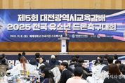 한국시사경제 대전취재본부 | 대전시교육청은 11월 8일'제5회 대전광역시교육감배 2025 전국 유소년 드론축구대회'를 배재대학교 21세기관 스포렉스홀에서 개최하여 성공적으로 마무리했다고 밝혔다. 이번 대회는 드론 산업이 주도하는 4차 산업혁명 시대에 걸맞은 창의ㆍ융합형 드론 인재 양성을 목적으로, 전국 초ㆍ중학교 유소년 드론축구팀 24개 팀이 참가해 열띤 경쟁을 펼쳤다. 참가팀은 예선전을 시작으로 16강, 8강, 4강, 결승에 이르는 토너먼트를 거치며 갈고닦은 기량을 발휘했다. 결승전에서는 구미신당팀(구미신당초등학교)이 SCJ YOUTH팀(충주덕신초, 충주중앙탑초, 충주금릉초 연합팀)을 상대로 2대 1의 세트 스코어로 승리하며 2025년 챔피언의 자리에 올랐다. 대전에서는 장동초등학교가 동상을 수상했다. 입상한 1~4위 팀에게는 대전광역시교육감상과 트로피가 수여됐다. 대전시교육청은 지난 2021년, 전국 최초로 유소년 드론축구대회를 출범한 이래 올해로 5년재 전국 규모로 개최해오고 있다. 이번 대회는 단순한 스포츠 경기를넘어, 미래 과학도시 대전의 이미지 제고, 청소년들의 창의적 진로 탐색 기회 확대, 드론 콘
