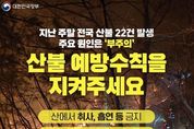 한국시사경제 문화팀 | 지난 주말 전국 산불 22건 발생 주요 원인은 '부주의' 산불 예방수칙을 지켜주세요 · 산에서 취사, 흡연 등 금지 · 산 근처에서 쓰레기 소각 금지 · 연기, 불씨 보면 119 신고 "불법소각, 꽁초 투기 등 위반 행위 엄정 대응"