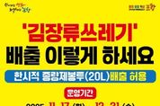 한국시사경제 문화팀 | 포항시는 김장철을 맞아 일시적으로 다량 배출되는 김장부산물 쓰레기를 원활히 처리하기 위해 ‘김장부산물쓰레기 특별 수거기간’을 운영한다고 밝혔다. 특별 수거기간은 11월 17일부터 12월 31일까지 약 6주간 진행되며, 이 기간 동안 발생하는 김장부산물 쓰레기는 한시적으로 종량제봉투 20L에 배출이 허용된다. 시는 유동인구가 많은 읍·면·동 주요 지역에 현수막을 설치해 특별 수거기간을 홍보하고, 각 행정복지센터를 통해 올바른 김장쓰레기 배출 방법과 관리 기준을 시민들에게 안내하고 있다. 음식물쓰레기 배출대상은 배추·무 등 김장으로 나오는 쓰레기로 최대한 물기 및 이물질 제거 후 일반쓰레기와 별도로 배출하여야 한다. 또한 일반쓰레기 배출대상은 배추겉잎, 밑동, 양파·마늘껍질, 생강 및 흙이 묻은 식재료로 종량제봉투로 배출해야 한다. 포항시 관계자는 “김장철에는 부산물쓰레기가 짧은 기간에 집중적으로 발생하는 만큼 특별 수거기간을 운영하게 됐다”며 “올바른 배출 방법을 적극적으로 안내해 부산물쓰레기 수거에 차질이 없도록 최선을 다하겠다”고 말했다.