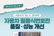 한국시사경제 문화팀 | 자동차 필름식 번호판 품질·성능 개선 (시행시기 2026.11.28.부터) - 품질 강화: 필름 접착력·연료 저항성 등 시험기준 강화 - 야간 시인성: 반사 성능 최대 6배 강화 - 보증 기간: 최초 발급일로부터 5년 무상 보증