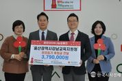 한국시사경제 울산취재본부 | 울산 강남교육지원청은 연말연시를 맞아 29일 울산사회복지공동모금회에 이웃사랑 나눔 성금 379만 원을 전달했다. 울산사회복지공동모금회에서 열린 전달식에는 임채덕 교육장을 비롯해 양호영 울산사회복지공동모금회 사무처장 등이 참석했다. 강남교육지원청은 해마다 희망 직원을 대상으로 매달 급여에서 ‘작은 사랑의 씨앗’으로 일정 금액을 공제해 성금을 모았다. 강남교육지원청은 2014년부터 사회복지단체에 기부하며 지역사회와 상생하는 나눔 문화를 실천하고 있다. 임채덕 교육장은 “연말을 맞아 직원들의 따뜻한 마음을 모아 지역사회에 온정을 전하고자 했다”라며 “앞으로도 교육공동체의 사회적 책임을 실천하며 지역사회와 함께 성장하는 나눔 활동을 이어가겠다”라고 말했다.