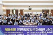 한국시사경제 이정이 기자 | 용인특례시는 10일 시청 컨벤션홀에서 민족통일 용인특례시협의회 주관으로 ‘민족통일 용인특례시대회와 제56회 한민족통일문화제전 시상식’이 열렸다고 밝혔다. 이날 행사는 한반도의 평화와 통일을 주제로 한 글짓기·웹툰·포스터·사진 공모전의 입상작을 시상하고, 유공회원에게 표창을 수여하고자 마련됐다. 민족통일 용인특례시협의회는 1981년 창립한 단체로 매년 태극기 나눔을 비롯해 지역사회 통일운동 의식 제고 등을 위한 다양한 활동을 벌이고 있다. 이날 협의회는 홍보자료 시청, 통일 관련 동영상과 남북 언어 차이에 대한 학습자료를 시청하고 간단한 통일 퀴즈대회를 거쳐 우수 작품 3개를 낭독했다. 이어진 시상식에서는 용인특례시장상 3명 등 총 36명이 수상의 영예를 안았다. 유한종 민족통일 용인특례시협의회장은 “민족의 염원인 한반도 평화통일을 위해 어려운 여건 속에서도 적극 지원해 주시는 이상일 시장님께 감사드린다”며 “대한민국 통일의 그 날이 올 때까지 협의회 회원의 뜻을 한데 모아 더욱 적극 활동하겠다”고 했다. 이상일 시장은 “대한민국이 한국전쟁의 비극