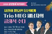 한국시사경제 이정이 기자 | 화순군은 '2025 군민행복 아카데미의 마지막 10회차 강연을 오는 12월 10일 오후 3시에 화순군청 4층 대회의실에서 개최한다고 밝혔다. 이번 강연은 클래식 연주단체 Trio MEG를 초청해 ‘사랑이 필요한 당신에게 – Trio MEG 세 남자의 클래식 수다’를 주제로 진행된다. 피아노(김용진)·바이올린(오현)·첼로(윤여훈)의 실내악 연주와 해설을 곁들인 클래식 토크 콘서트 형식으로, 누구나 공감할 수 있는 ‘사랑’을 테마로 재해석한 명곡을 군민들에게 들려줄 예정이다. Trio MEG는 2017년 창단한 클래식 전문 연주단체로 ‘Music makes Everything Grow(음악은 모든 것을 성장시킨다)’를 슬로건으로 활동하고 있다. 50여 곡의 명곡을 재창작해 발표했으며, 전국 문화재단 · 교육기관 · 지자체 · 기업 등에서 활발한 공연 활동을 이어오고 있다. 또한 KBS 클래식FM, TBS 교통방송, 한경ARTE TV 등에도 다수 출연했다. 조미화 화순군 인구청년정책과장은 “2025년 한 해 동안 군민행복 아카데미에 함께해 주신 군민