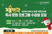 한국시사경제 전남취재본부 | 여수시가 운영하는 5개 공립 작은도서관에서 오는 2026년 1월 5일부터 8일까지 ‘겨울방학 독서문화 프로그램’ 수강생 106명을 선착순 모집한다. 이번 프로그램은 방학을 맞아 학생과 성인을 대상으로 독서를 통해 창의력·사고력을 증진하기 위한 다양한 독서문화 프로그램으로 마련됐다. 운영 기간은 오는 2026년 1월 12일부터 2월 24일까지며 프로그램별 기간이 다르다. 운영 작은도서관은 ▲여문늘벗(구 중부보건지소) ▲꿈을키우는(미평 선경 3차 아파트) ▲화양열린(화양면민회관 2층) ▲청솔글누리(돌산 청솔 2차 아파트) ▲국동(국동 임시별관 1층) 등 5곳이다. 운영 프로그램은 ▲여문늘벗 ‘독서와 보드게임으로 즐기는 세계사(1.16.~2.20.)’ ▲꿈을키우는 ‘하루 한 줄, 그림책 필사(1.12.~1.16.)’, ‘그림책 속 색깔 마법(1.19.~1.23.)’ ▲화양열린 ‘마음보석이 빛나는 그림책 이야기’(1.14.~1.30.), ‘책톡! 영상톡! 나만의 책을 영상으로 표현하기(1.13.~1.29.)’ ▲청솔글누리 ‘책이 들려주는 그림소리(1.13.~2.24.)’, ‘책과 함께 실타
